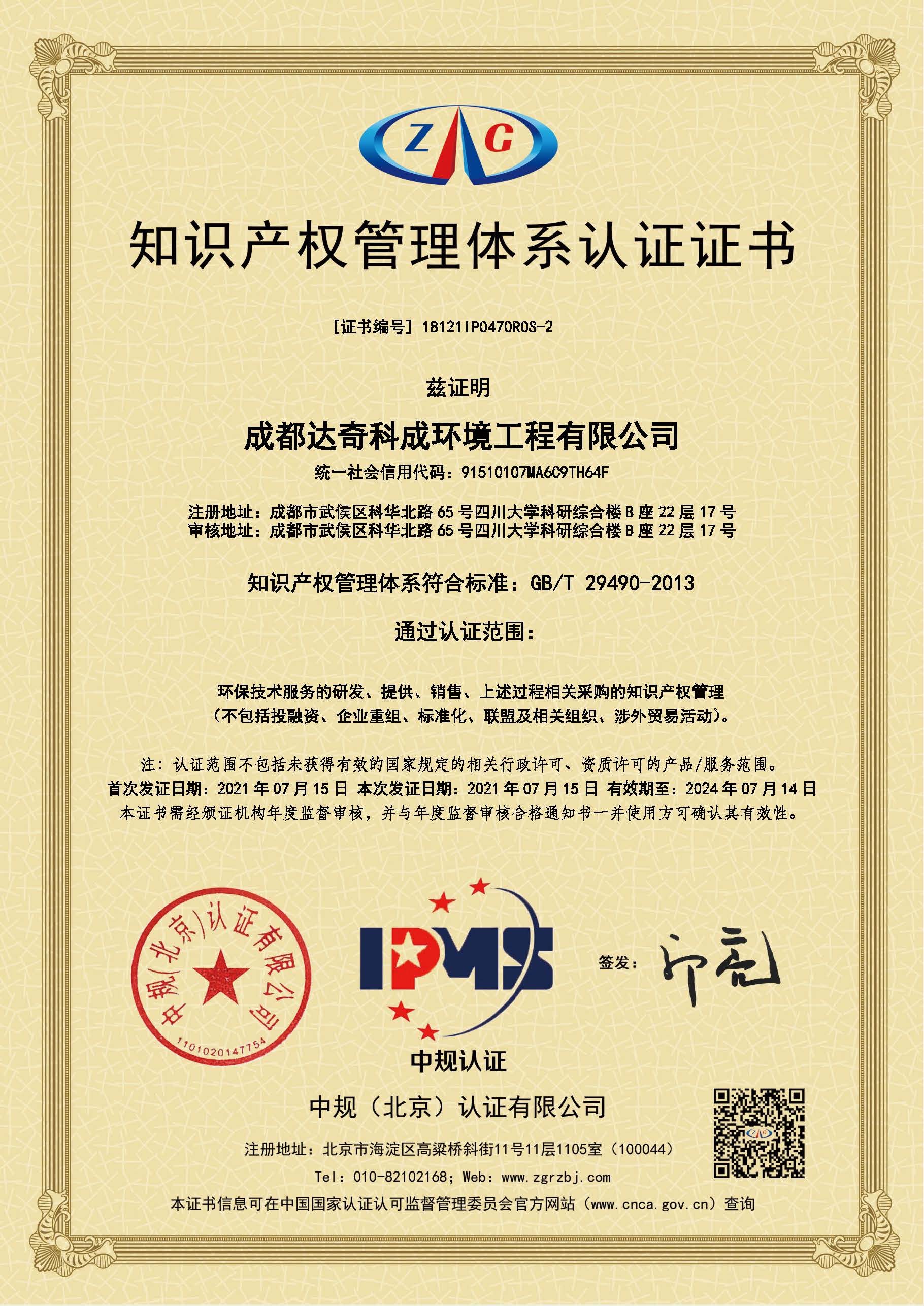 2021年7月15日,成都达奇环境科技有限公司、成都达奇能自科技有限公司、成都达奇科成环境工程有限公司均已顺利完成了知识产权管理体系认证。