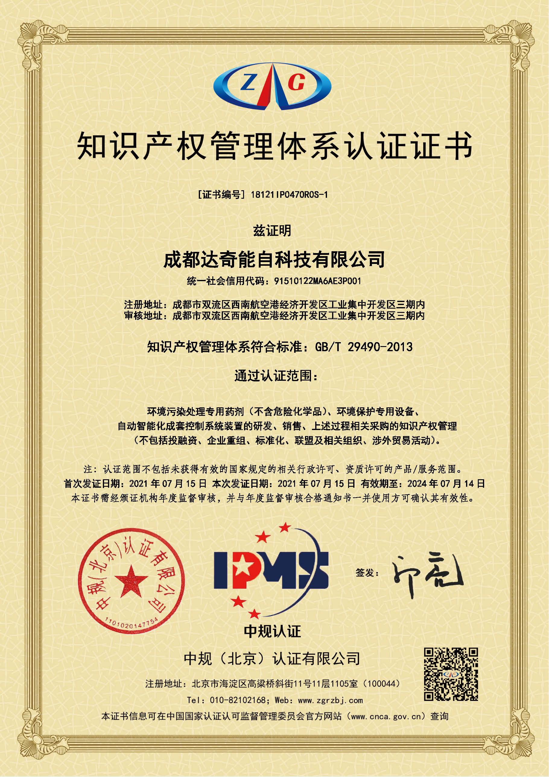 为积极响应国家关于知识产权强国建设工作指导,达奇环境也贯彻落实了对其自主研发技术与产品的知识产权体系的完善,于2021年7月15日,成都达奇环境科技有限公司、成都达奇能自科技有限公司、成都达奇科成环境工程有限公司均已顺利完成了知识产权管理体系认证。